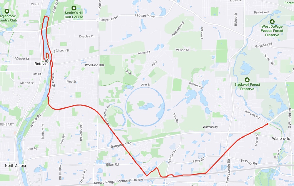 Sunday was very wet all morning (as the Fox Valley marathoners could testify!) I waited until the rain stopped around 2:00 p.m., and did 24 miles, finishing in Batavia at sunset. It had turned into a beautiful afternoon to tour the countryside on foot!