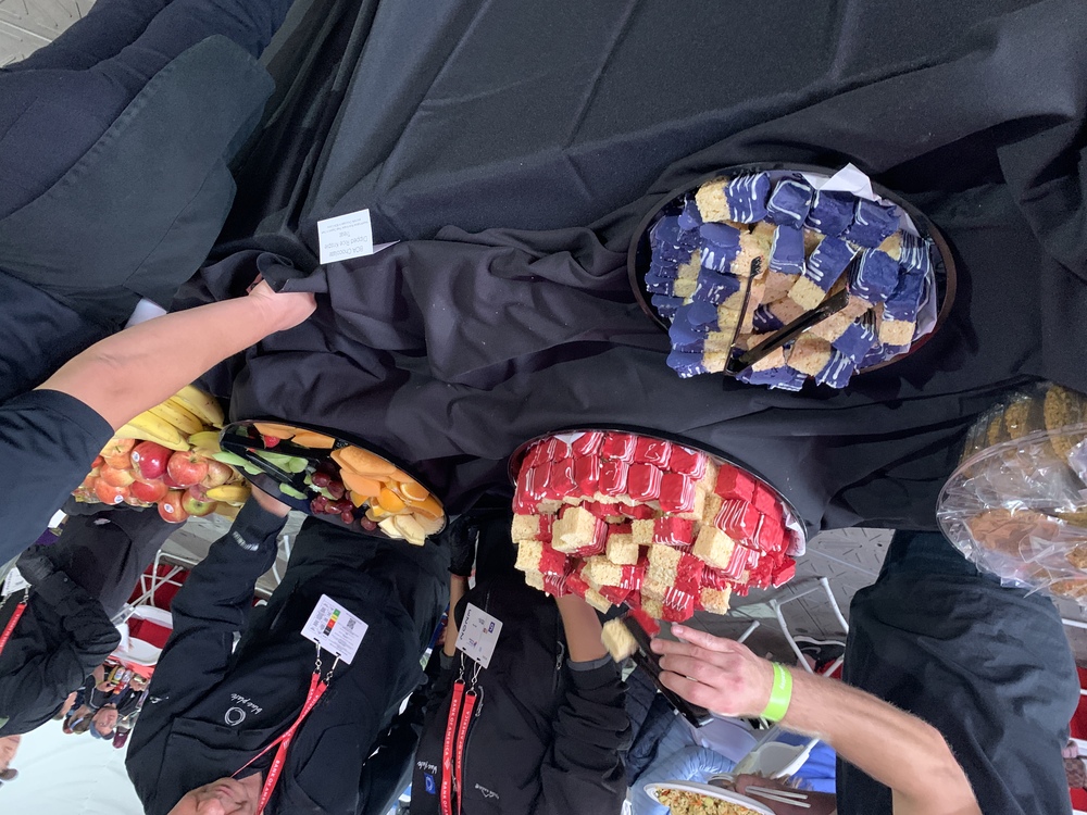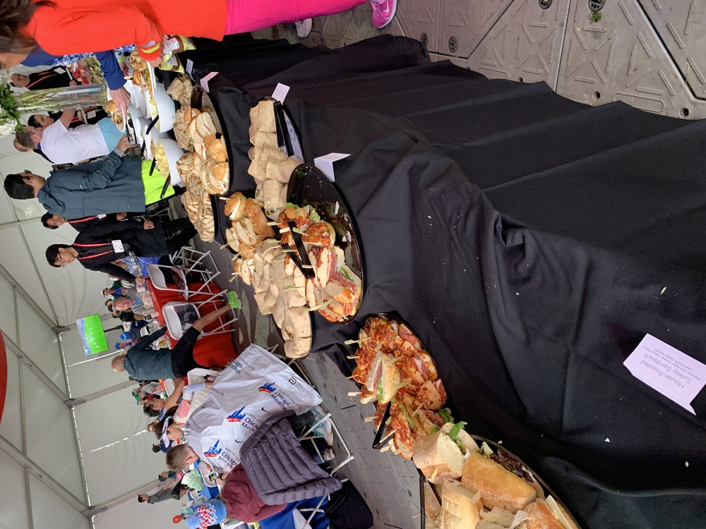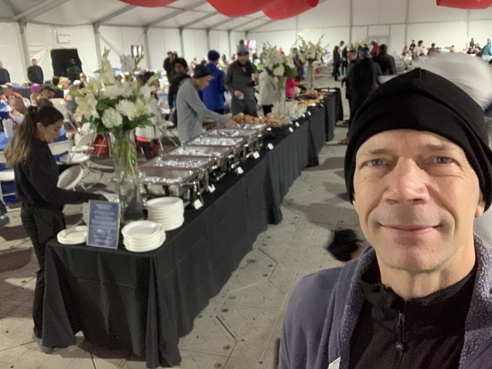 I had signed up early and paid $170 extra for a ticket to the Hospitality Tent–pricey, but worth it! Post-race massage, lots of food, heated, private portapotties and gear check, and a visit by the men’s and women’s winners.