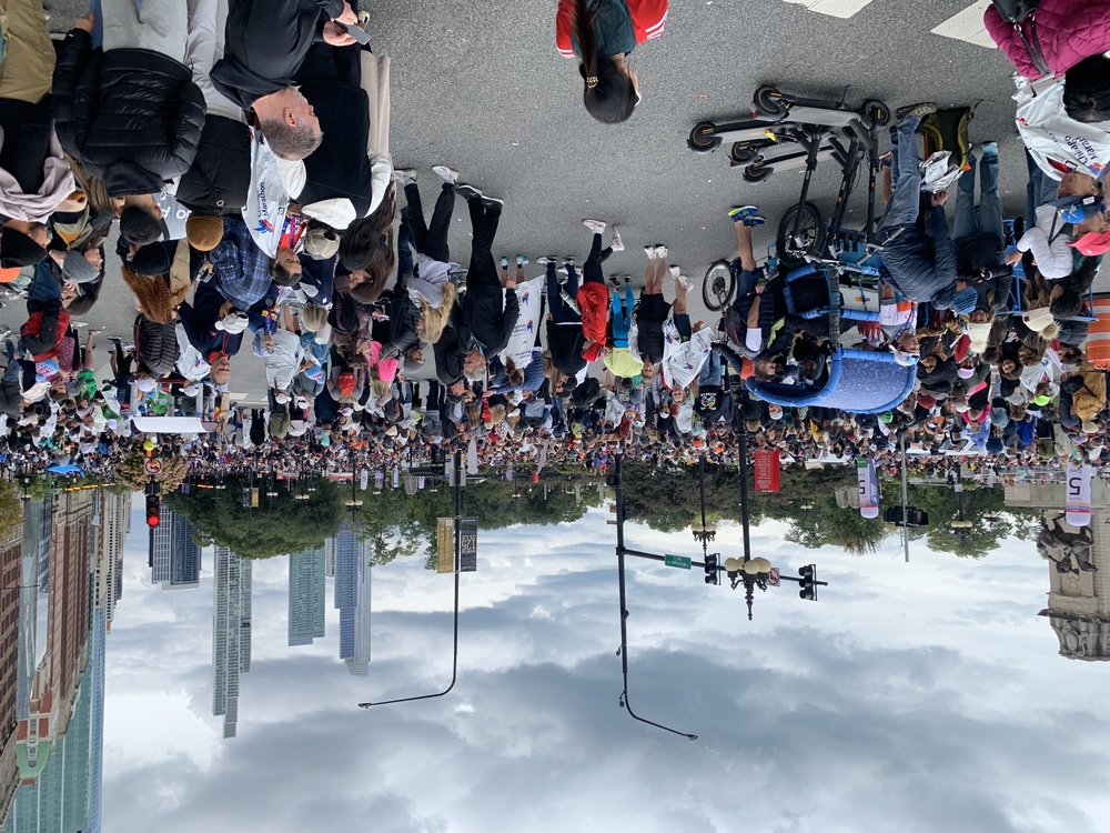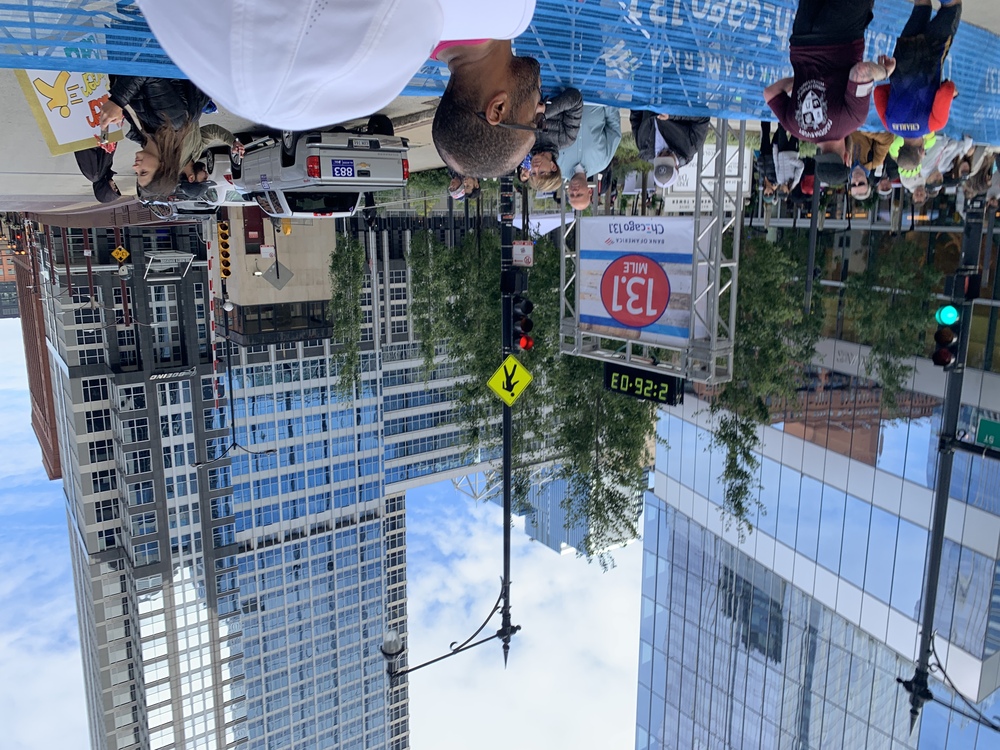There were twenty-one aid stations arranged along the course. Every aid station visit was a chaotic pit stop: Merge from the middle to the side, grab a cup of water or Gatorade cup, merge back without spilling your liquid or crashing into other merging runners, drink while running, and rejoin your pace group, who somehow seemed not to slow down during this process 🤔. I was carrying a 14-oz squirt bottle, which meant I could skip a couple aid stations, IF I managed to snatch and transfer three cups in the same pit stop.