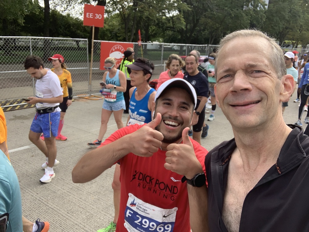 Dick Pond running buddy Orlando Lara found me at about this time. We were both in Corral F and were aiming for 3:50-ish, but had not connected before now.